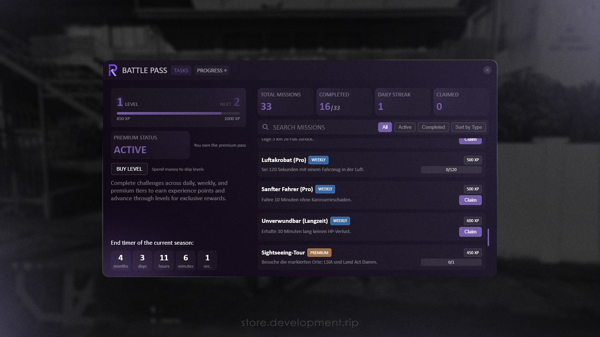 - Missions - Daily, weekly, and premium challenges with custom logic